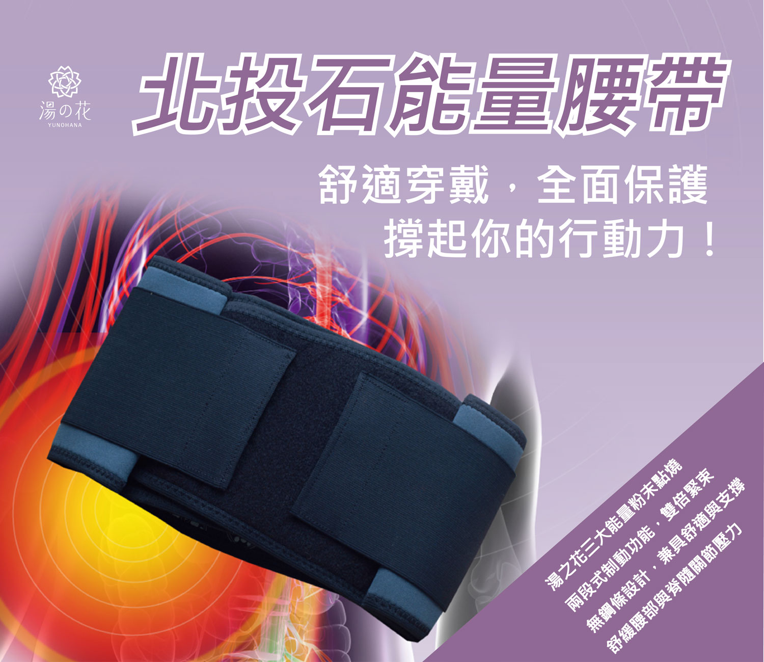湯之花三大能量粉末點燒,兩段式制度功能,雙倍緊束,無鋼條設計,兼具舒適與支撐,舒緩腰部與脊髓關節壓力。